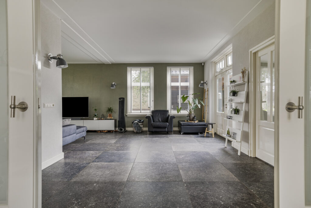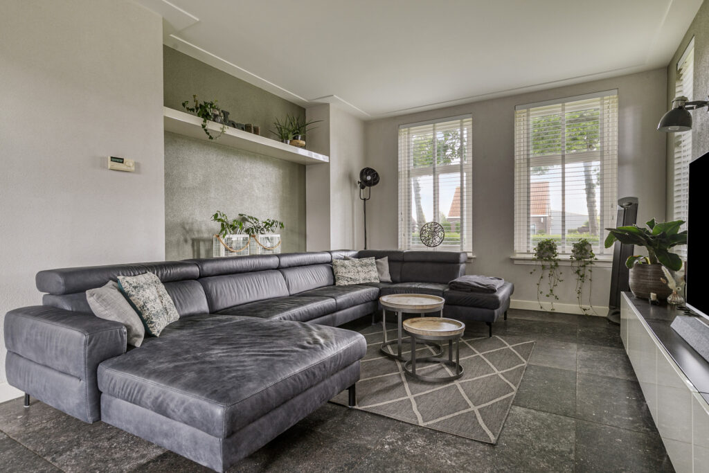 De woonkamer is gelegen aan de voorzijde en is voorzien van openslaande tuindeuren naar het terras.