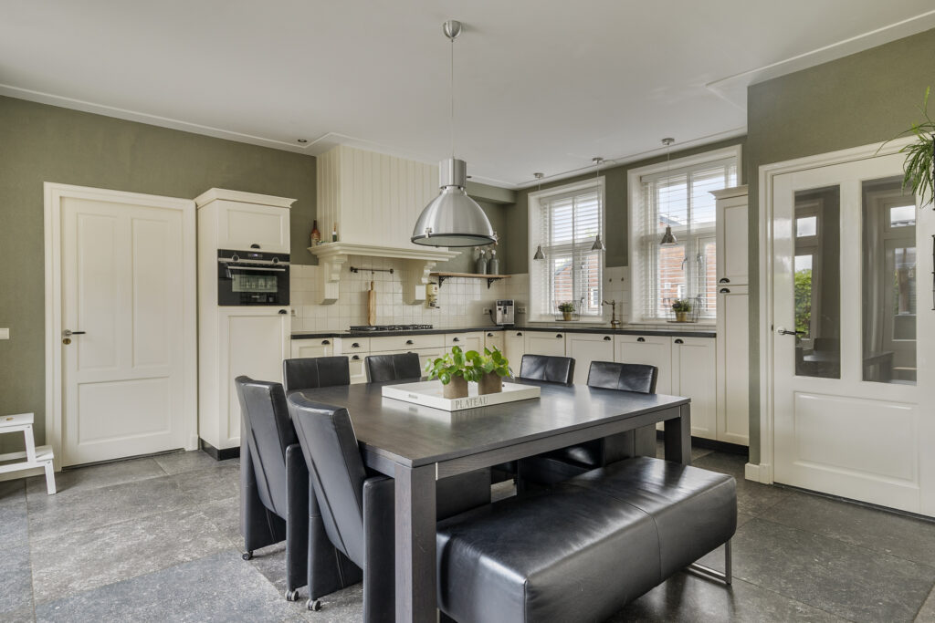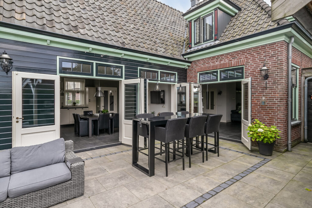 Woonkeuken in landelijke stijl met 2x dubbele tuindeuren naar het terras.