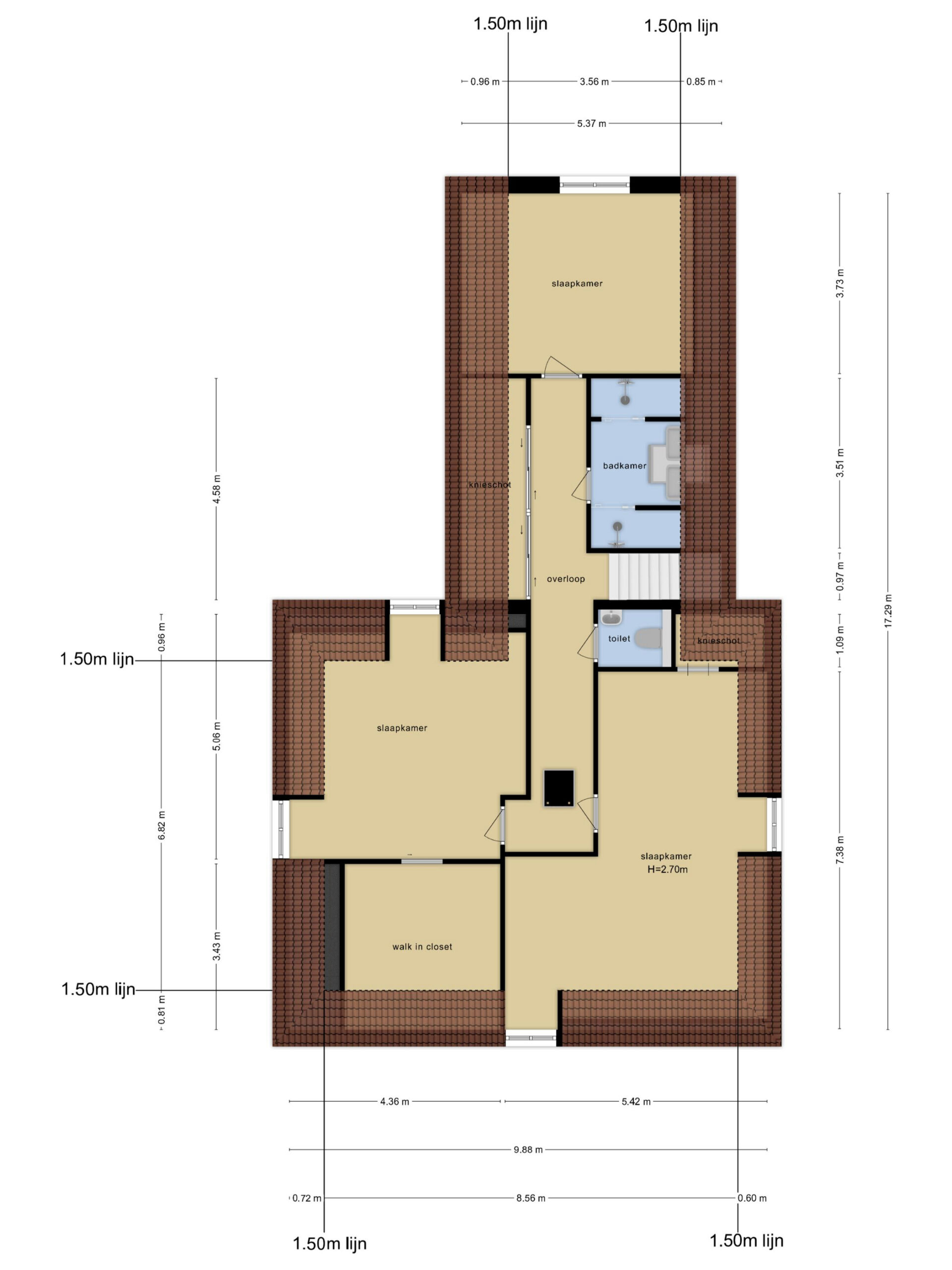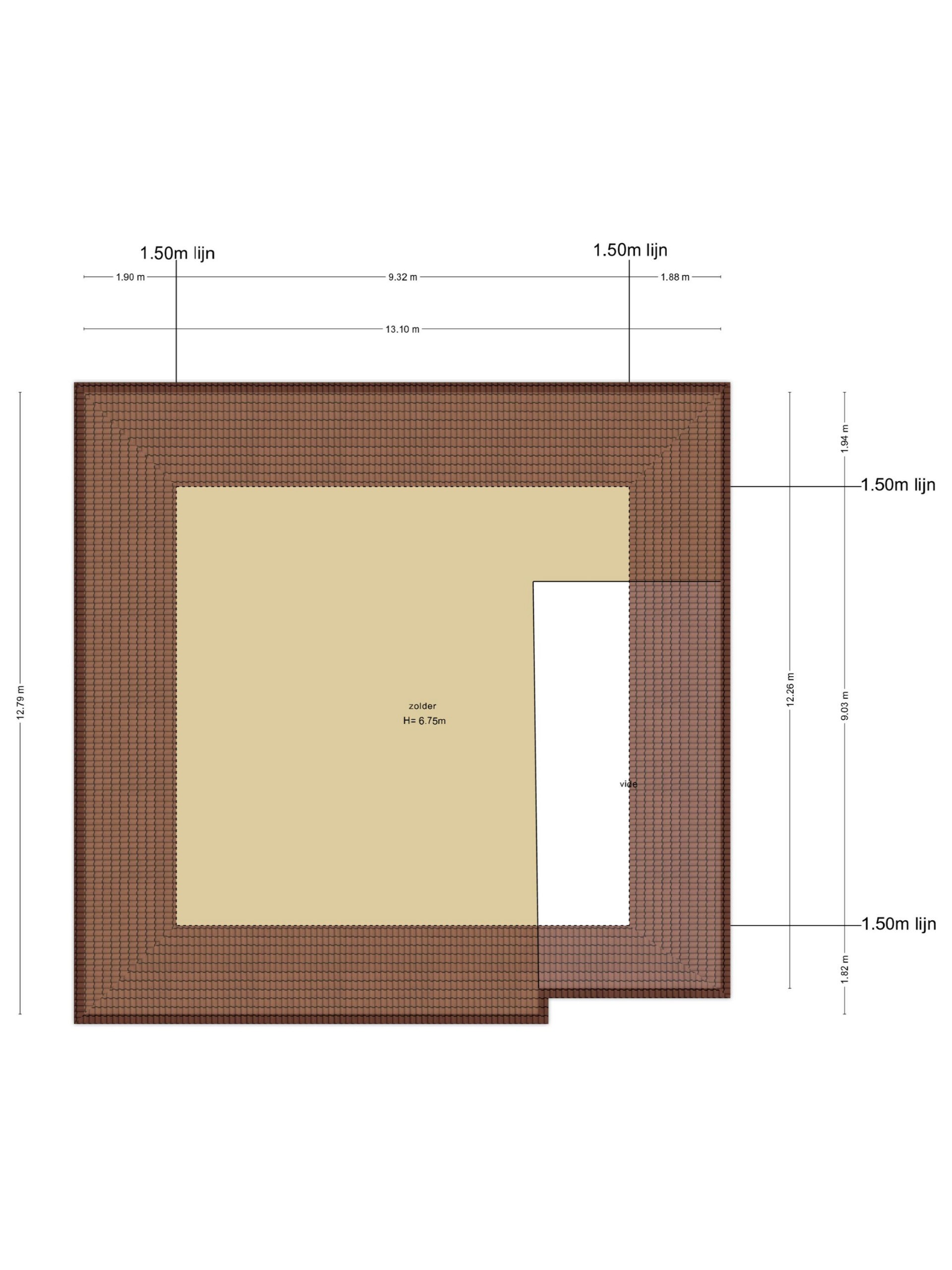 Afmetingen van 12,5 x 12,5 meter, met grote bergzolder.