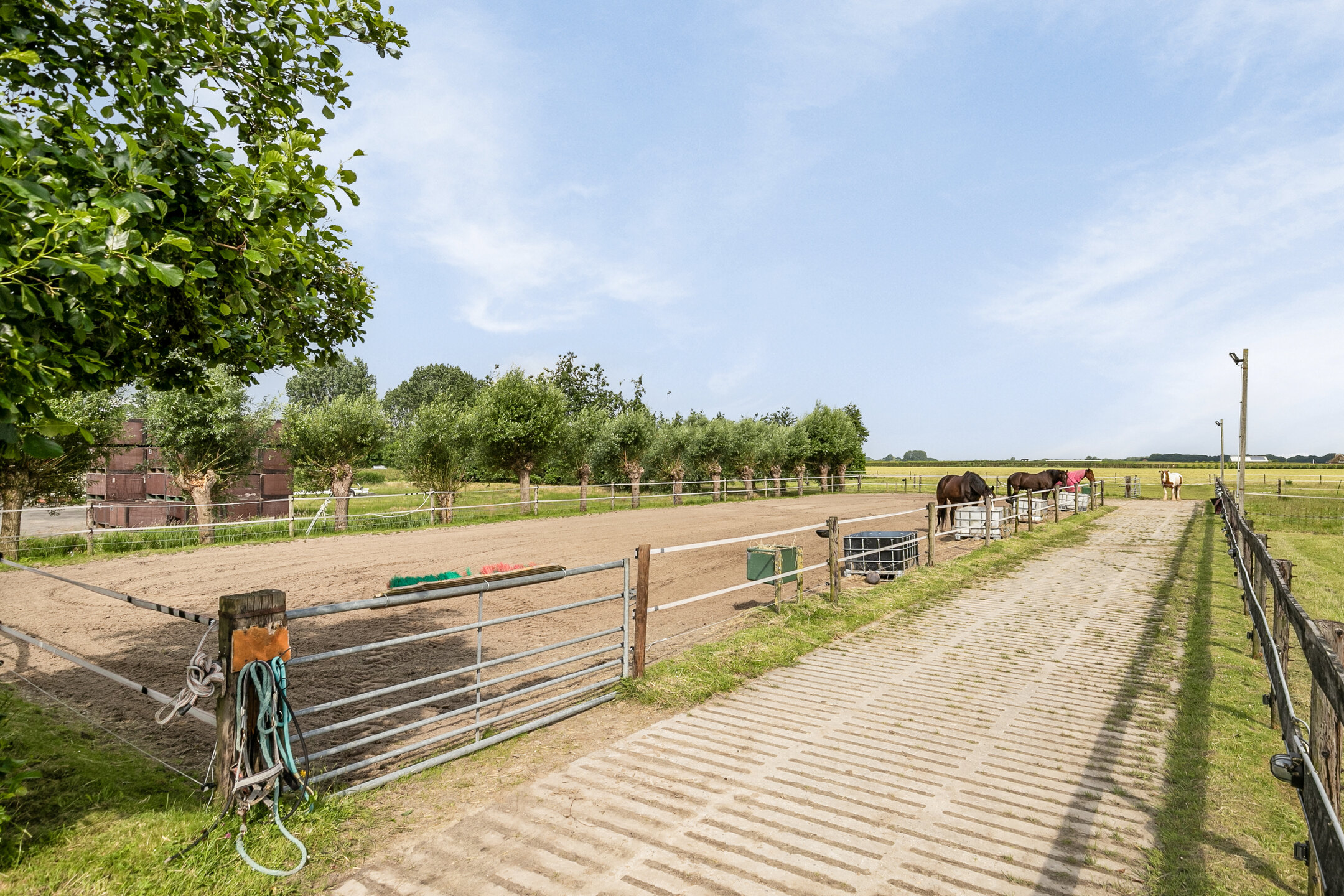 Verhard pad met verlichting tot aan het weiland en rijbak, met de volgende voorzieningen: