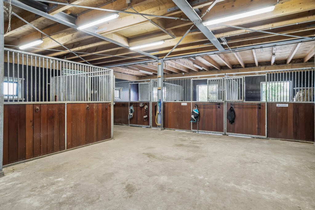 Indeling: werkplaats met buitendeur, paardenstalling met 5 boxen (3,15 x 3,5 meter) waarvan 1 ingericht kan worden tot merrie box, zadelkamer, solarium, electrische boiler, elektrakast (12 groepen), was-aansluiting, wasbak, openslaande darsdeuren, buitendeur, verlichting d.m.v. hotelschakeling, grote bergzolder.