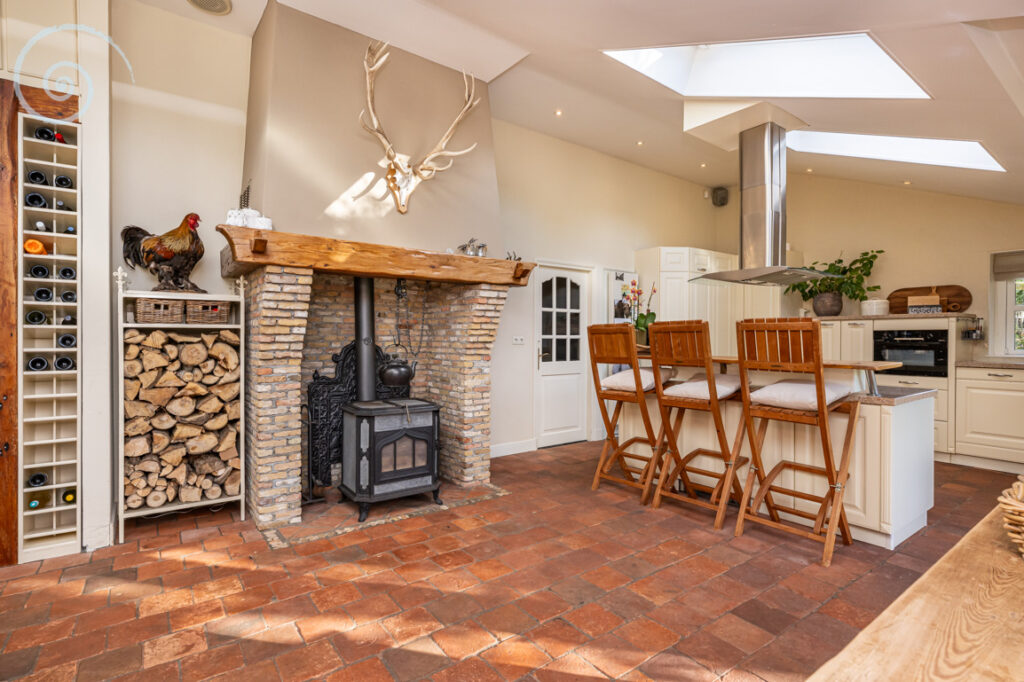 Aangrenzende treft u de woonkeuken met openslaande tuindeuren naar het terras en biedt een prachtig uitzicht en veel licht dankzij ramen en dakvensters. Estriken van enkele honderden jaren oud sieren de woonkeukenvloer. De keukenopstelling bestaat uit een hoekkeuken met kookeiland, lichte kastfronten en een stenen werkblad. Er is uitgebreide inbouwapparatuur aanwezig, waaronder een inductiekookplaat met afzuigkap, vaatwasser, koelkast, nieuwe combimagnetron, close-in boiler en kickspaces.