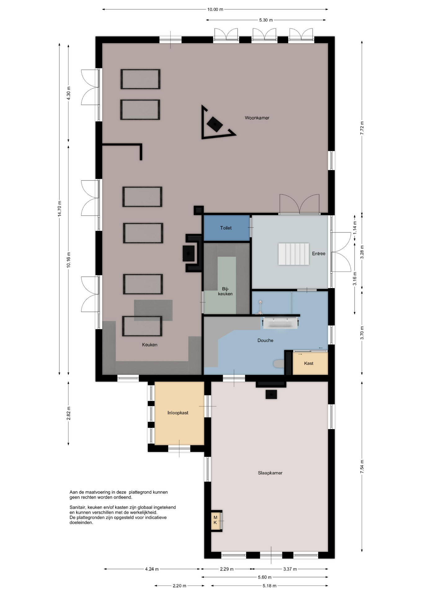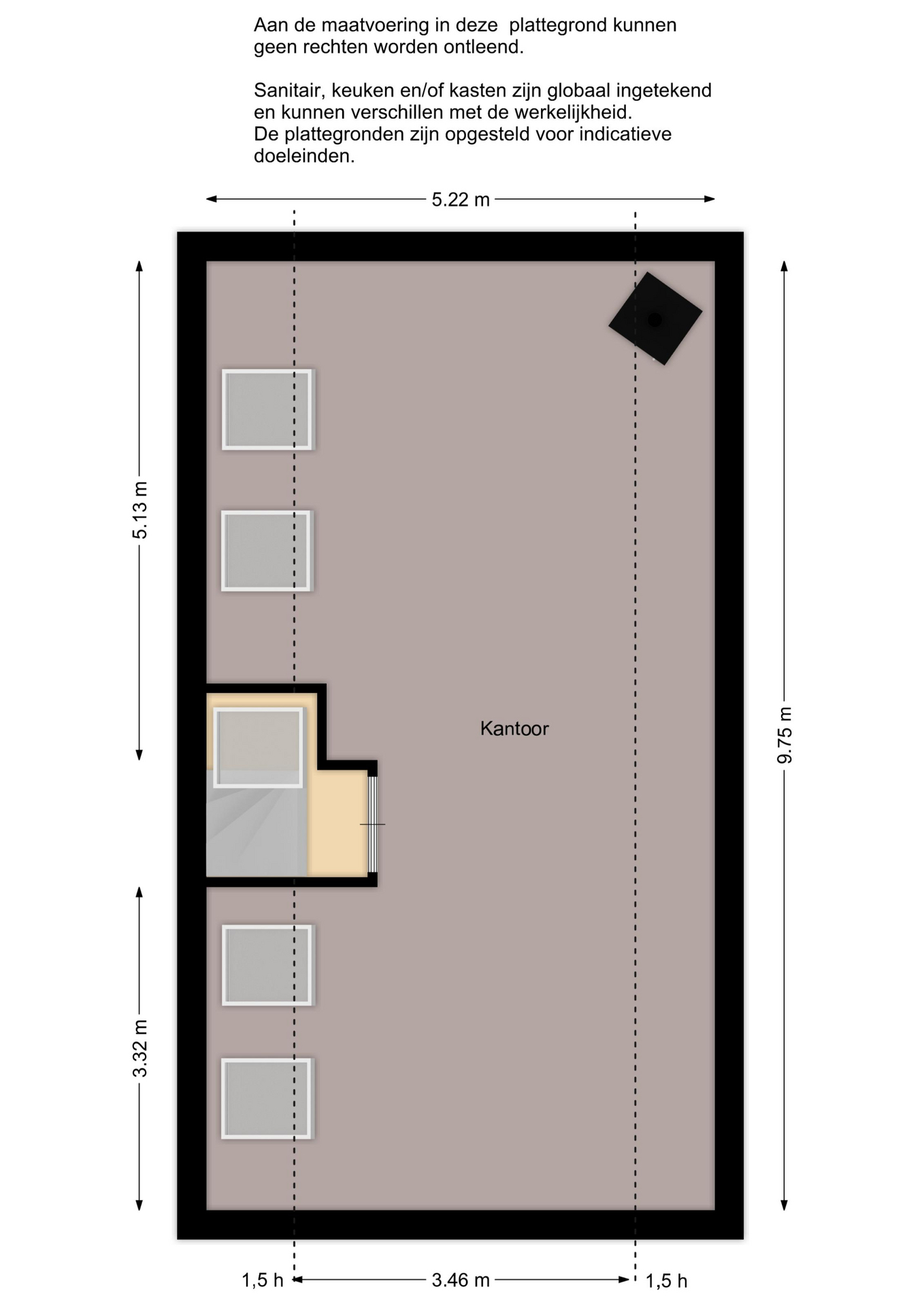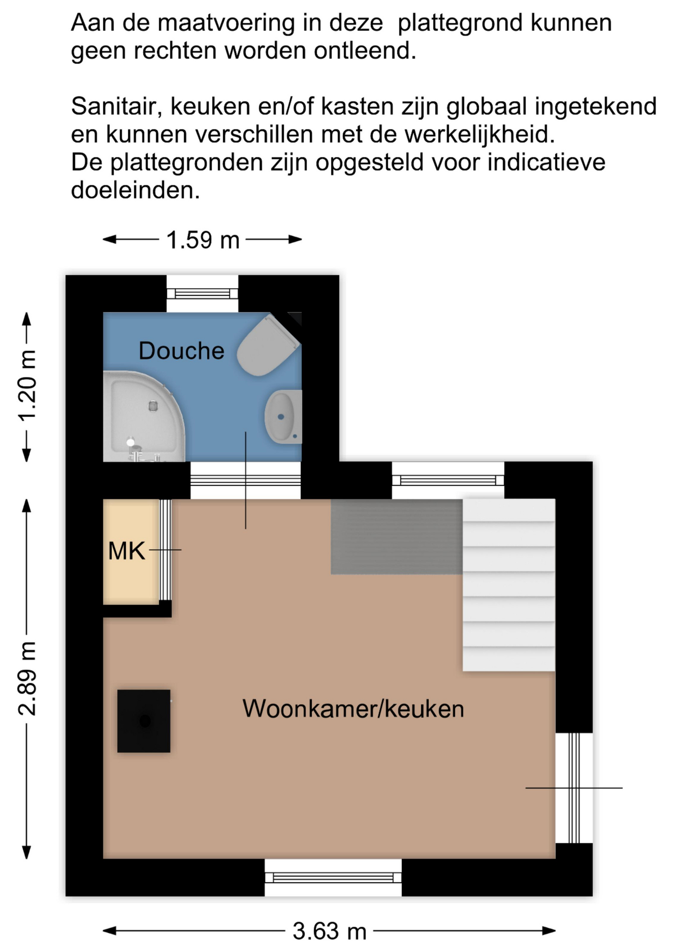 - Begane grond: Woonkamer, keuken, slaapkamer, badkamer