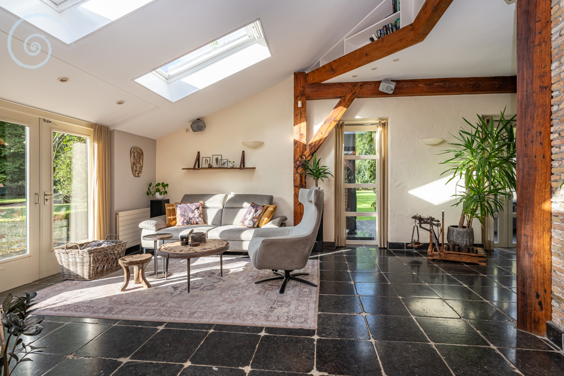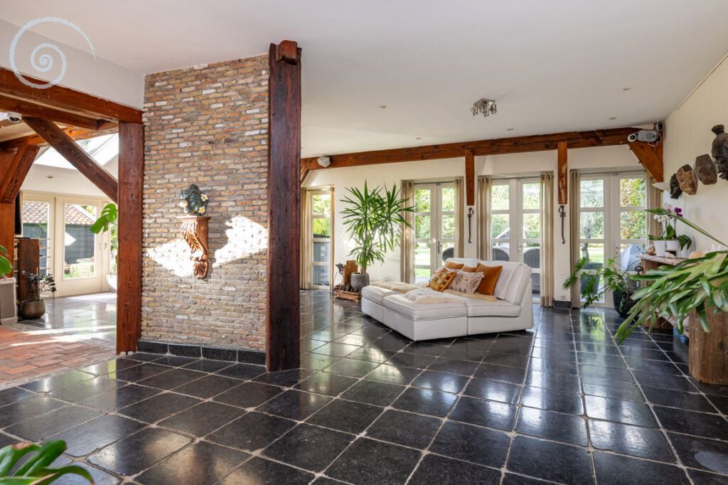 De woonkamer bereikt u via dubbele deuren vanuit de hal. Hier vindt u een royale zithoek met tuindeuren naar de tuin en een imposante schouw met houtkachel. De vloer is uitgevoerd in Belgisch hardsteen en de balken zijn gemaakt van kapok stuthout uit de VOC-tijd, wat de ruimte een unieke uitstraling geeft.